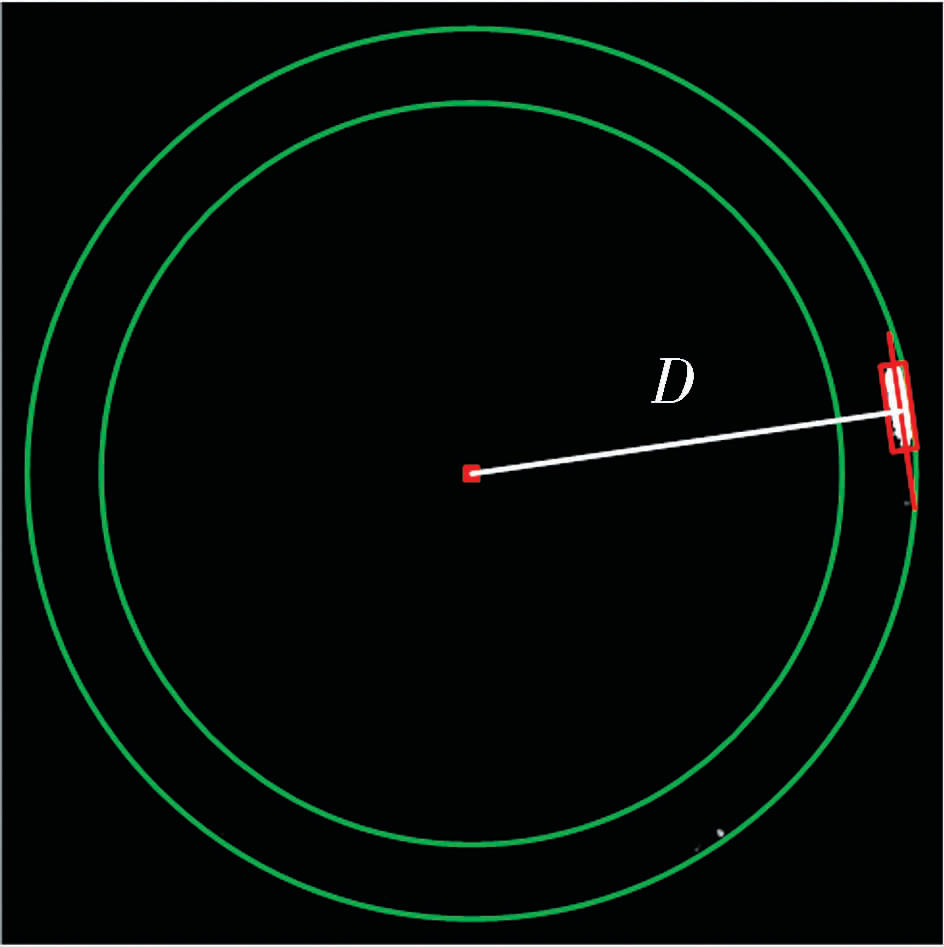 提取出缺陷后,計算該缺陷的區域面積S與區域輪廓長度L,如果缺陷面積與輪廓長度皆未超過設定閾值,則視為無此類型缺陷轉而進行下一缺陷的識別;否則進一步計算最小外接矩形主軸至小圓圓心的距離,由于車廢細化后呈圓弧形,故圓心至主軸的距離會大于小圓半徑,所以將小圓半徑設為距離閾值TD,若距離D超過閾值TD,則將此套圈判定為車廢缺陷。